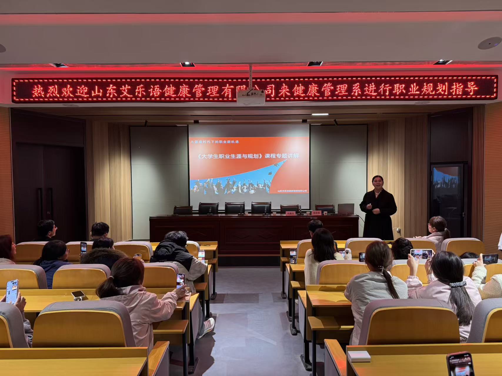 10月22日晚上,健康管理系在孔明校区实验楼101教室特邀山东艾乐语健康管理有限公司总监冯腾杰、孙倩倩为师生带来职业规划讲座,教师代表及学生代表共计100余人现场聆听此次讲座,健康管理系所有班级以直播形式观看此次讲座,讲座由健康管理系书记刘怀东主持,健康管理系班子成员参加。