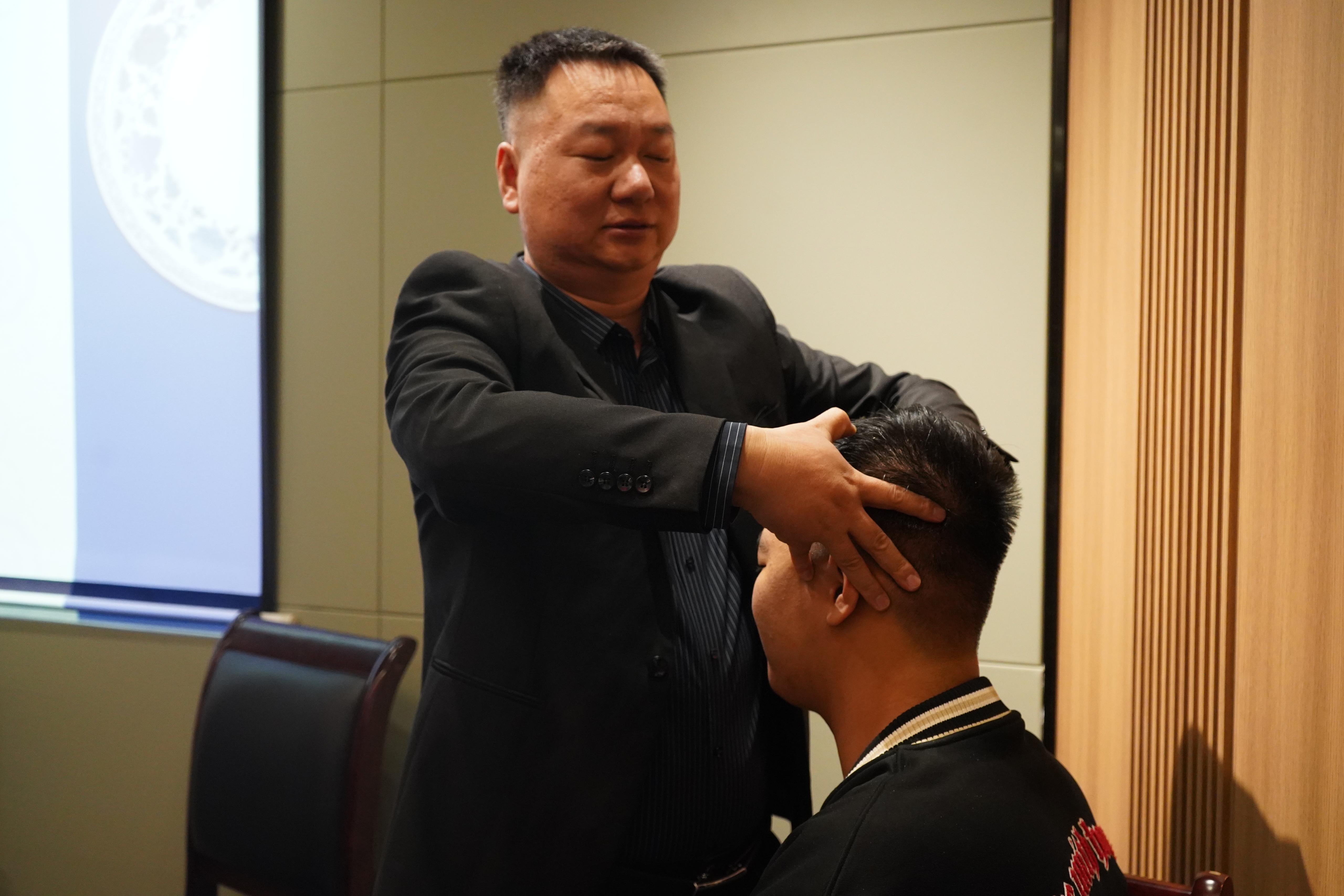 在非遗传承板块,王老师重点介绍了学校传统医药“非遗”学院的独特优势——作为全国唯一将健康管理与三项非遗技术深度融合的教学单位,所授张氏经络收放疗法等技艺,源自全国仅34项的“诊疗法”类国家级非遗,经四级评审认证,兼具权威性与实用性。他现场示范手三里穴按压、头部六穴按摩等实操技能,详解推拿、艾灸等“非破皮”技术的应用规范,提醒学子规避行业敏感词汇,坚守合规经营底线。