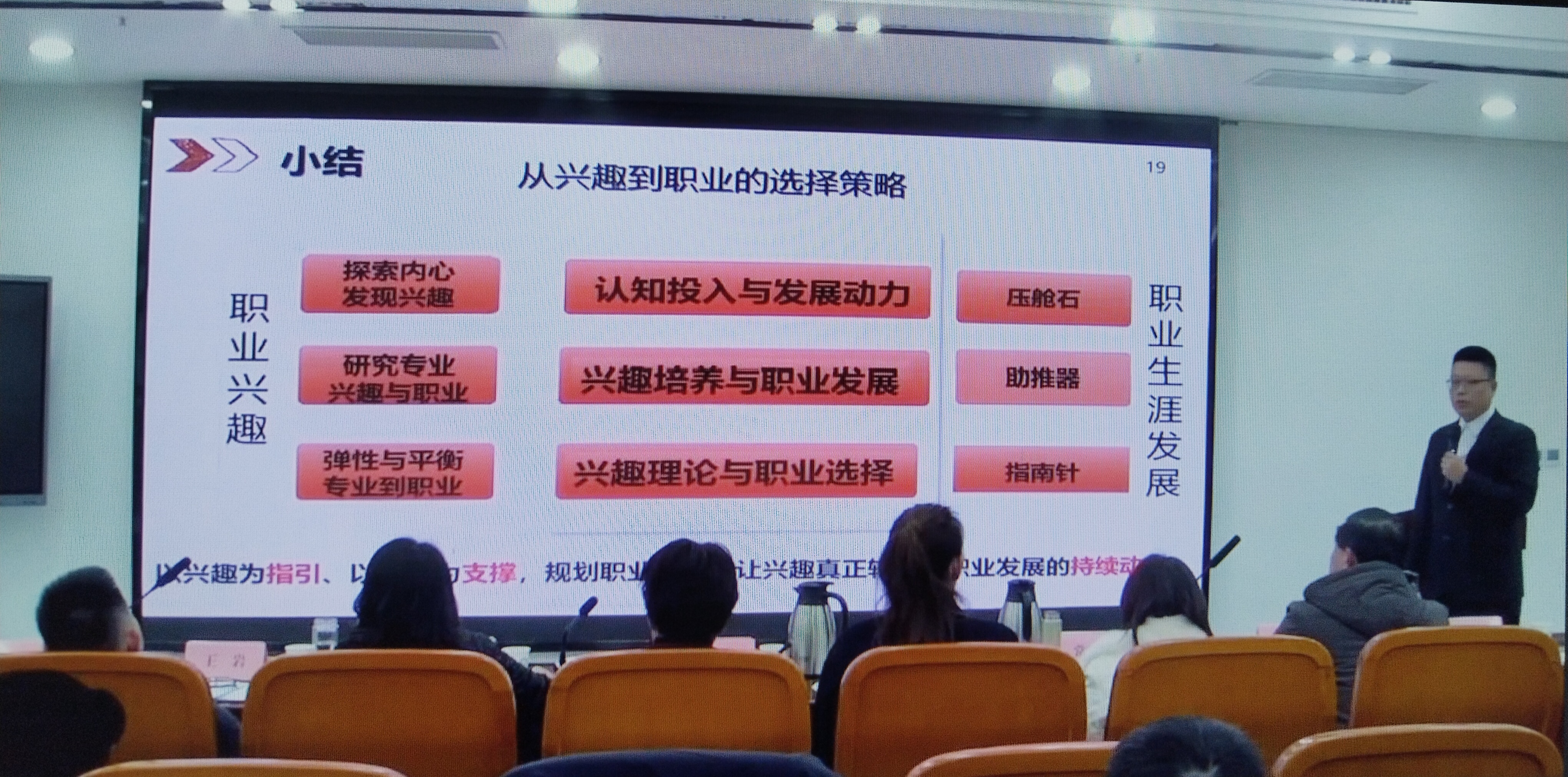 无生授课环节,团队以“从兴趣到职业选择策略”为主题,展现了基于BOPPPS模式的深度参与式课堂魅力。教师通过霍兰德职业兴趣测评数据分析,以“苹果树观察”案例生动解析六种职业兴趣类型,结合健康管理专业特色,提炼出“健康管理师、健康科普传播者、健康数据分析师”等职业发展方向。课堂中融入吴孟超院士“干一行爱一行”的榜样力量与“十五五规划”健康中国战略导向,通过“兴趣+技能”四象限理论、职业角色模拟等互动设计,引导学生辩证处理兴趣与专业、职业的关系,将个人发展融入行业发展大势。课后布置的10项职业探索清单与职业角色模拟实践,实现了“学思练”的闭环衔接。