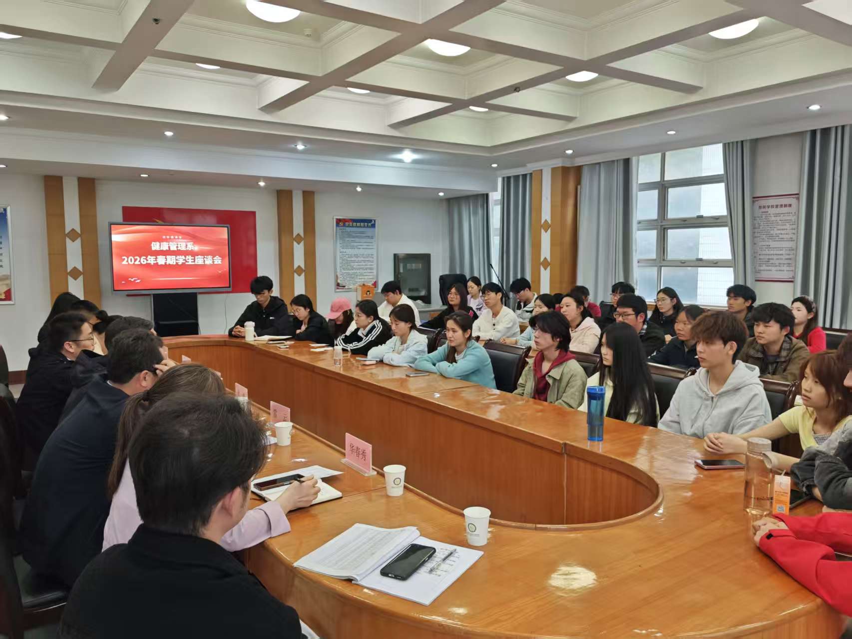 为切实倾听学生心声,精准了解学生学习生活需求,及时解决学生急难愁盼问题,进一步提升教育教学质量和学生管理服务水平,4月22日下午,健康管理系组织召开2026年春期学生座谈会。系党总支书记刘怀东、主任张峰、副书记张莹莹、副主任雷云,学工办、党政办、教学办全体工作人员及全体辅导员出席会议,各班级学生代表参会。