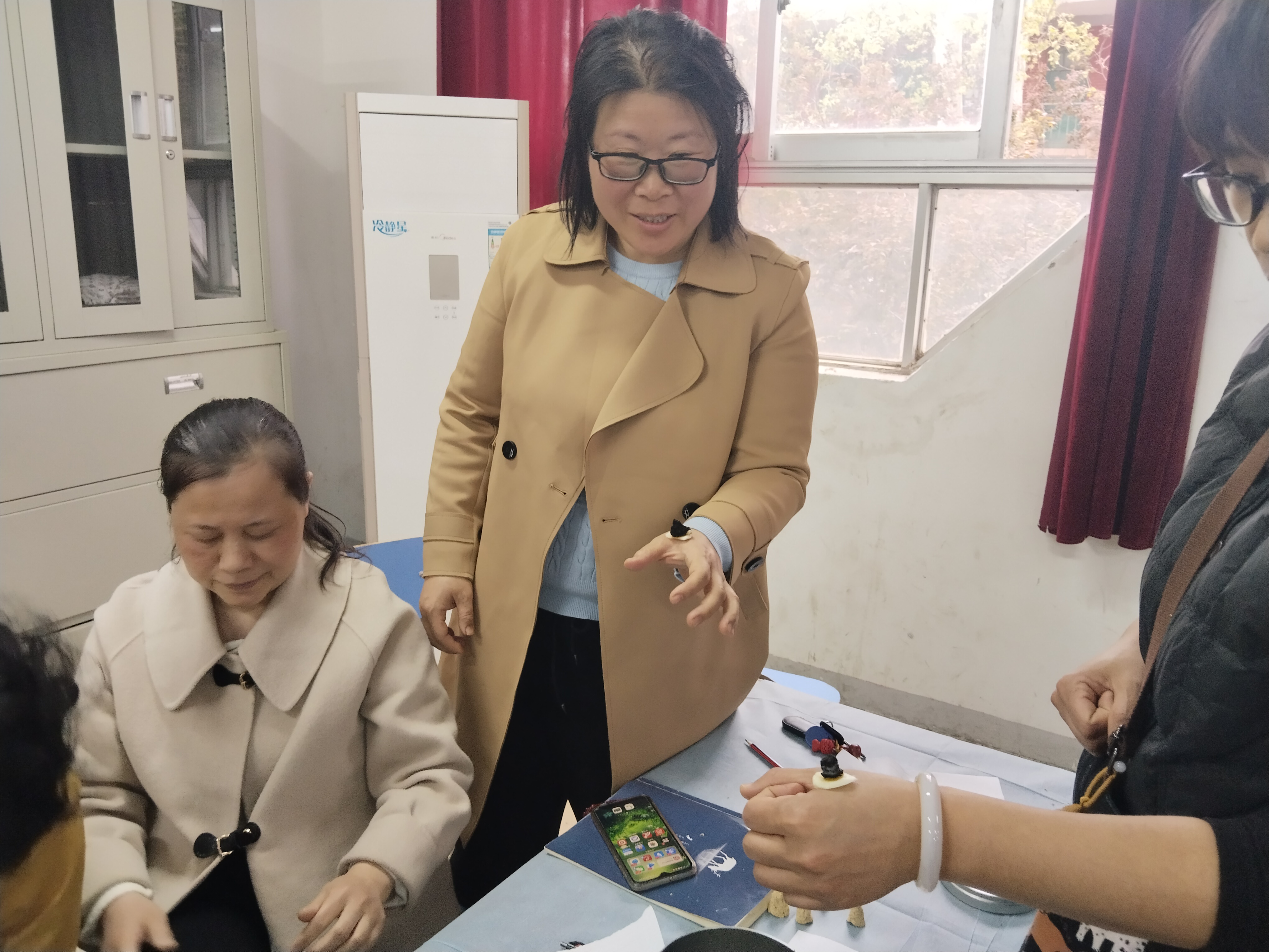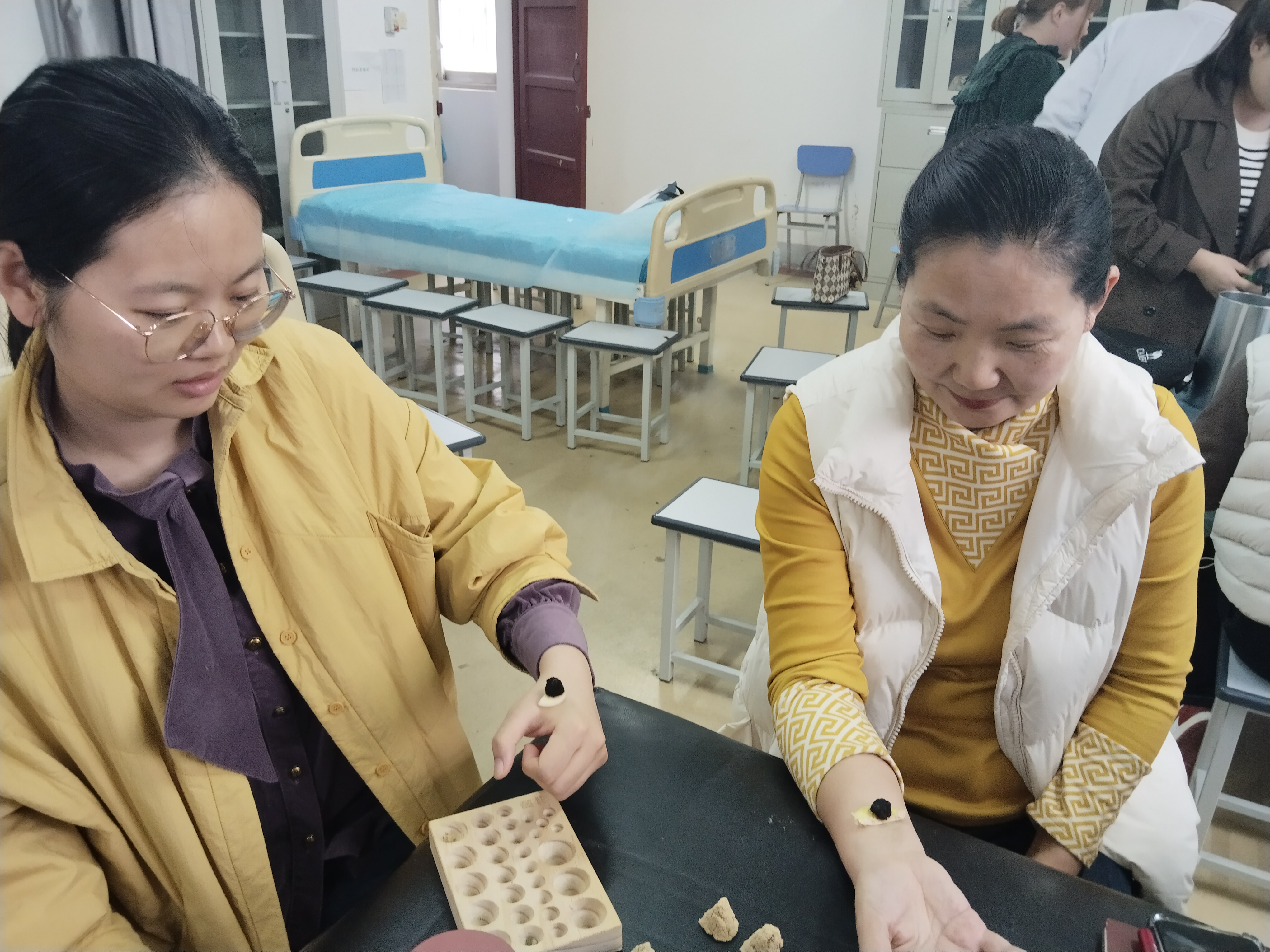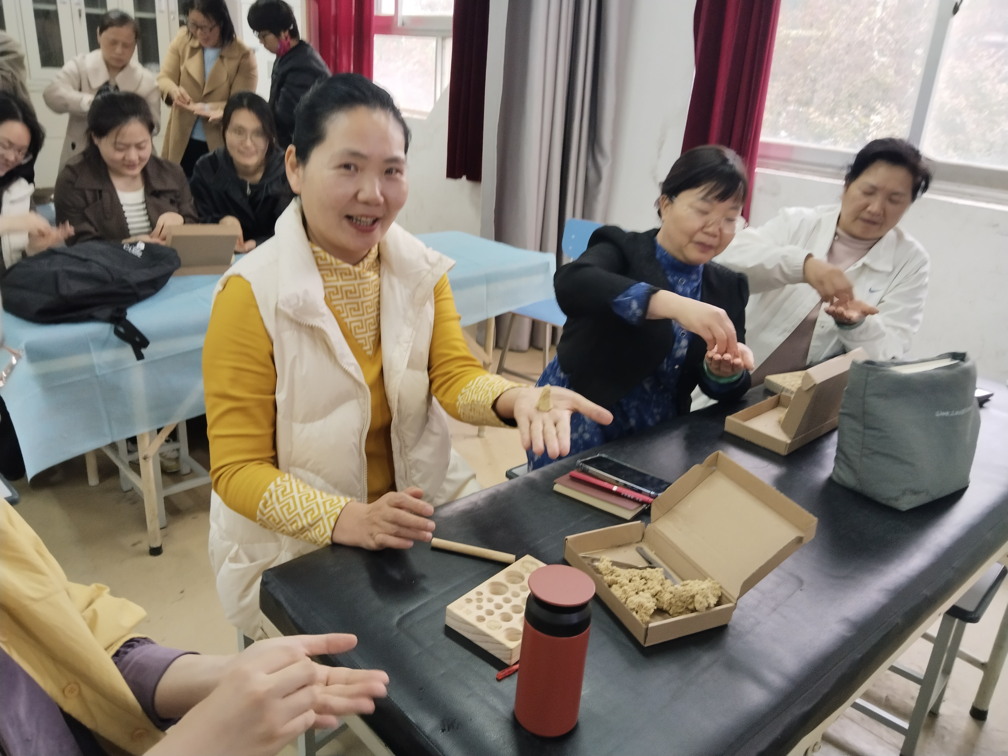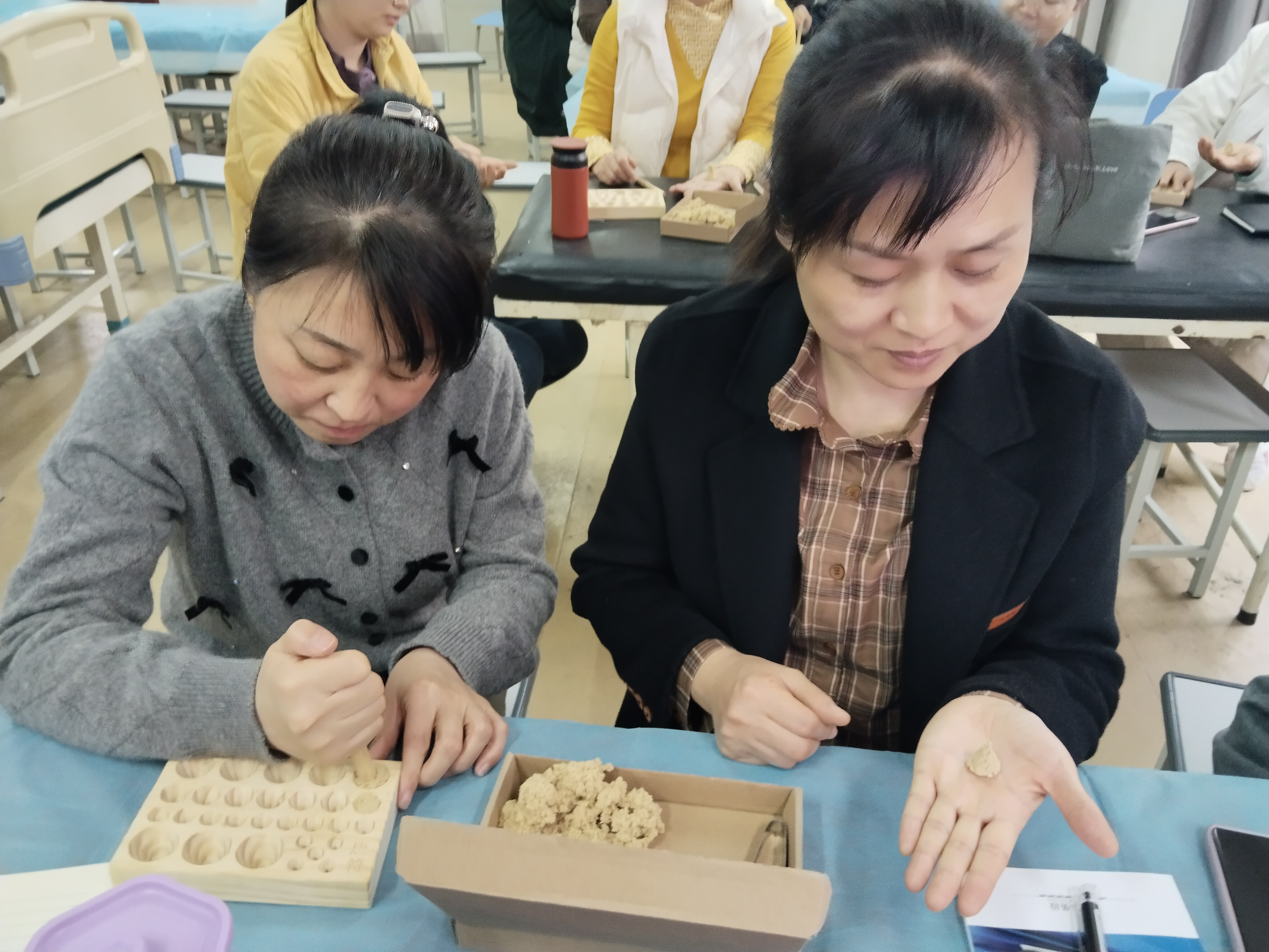 培训过程中,游老师注重理论与实践结合,现场指导老师们亲手制作艾柱,讲解艾柱捏制技巧、灸量单位“壮”的界定,并安排隔姜灸、隔蒜灸实操练习,让老师们在动手操作中掌握施灸要点,熟悉安全操作规范。老师们认真听讲、积极实操,及时请教疑问,现场学习氛围浓厚。