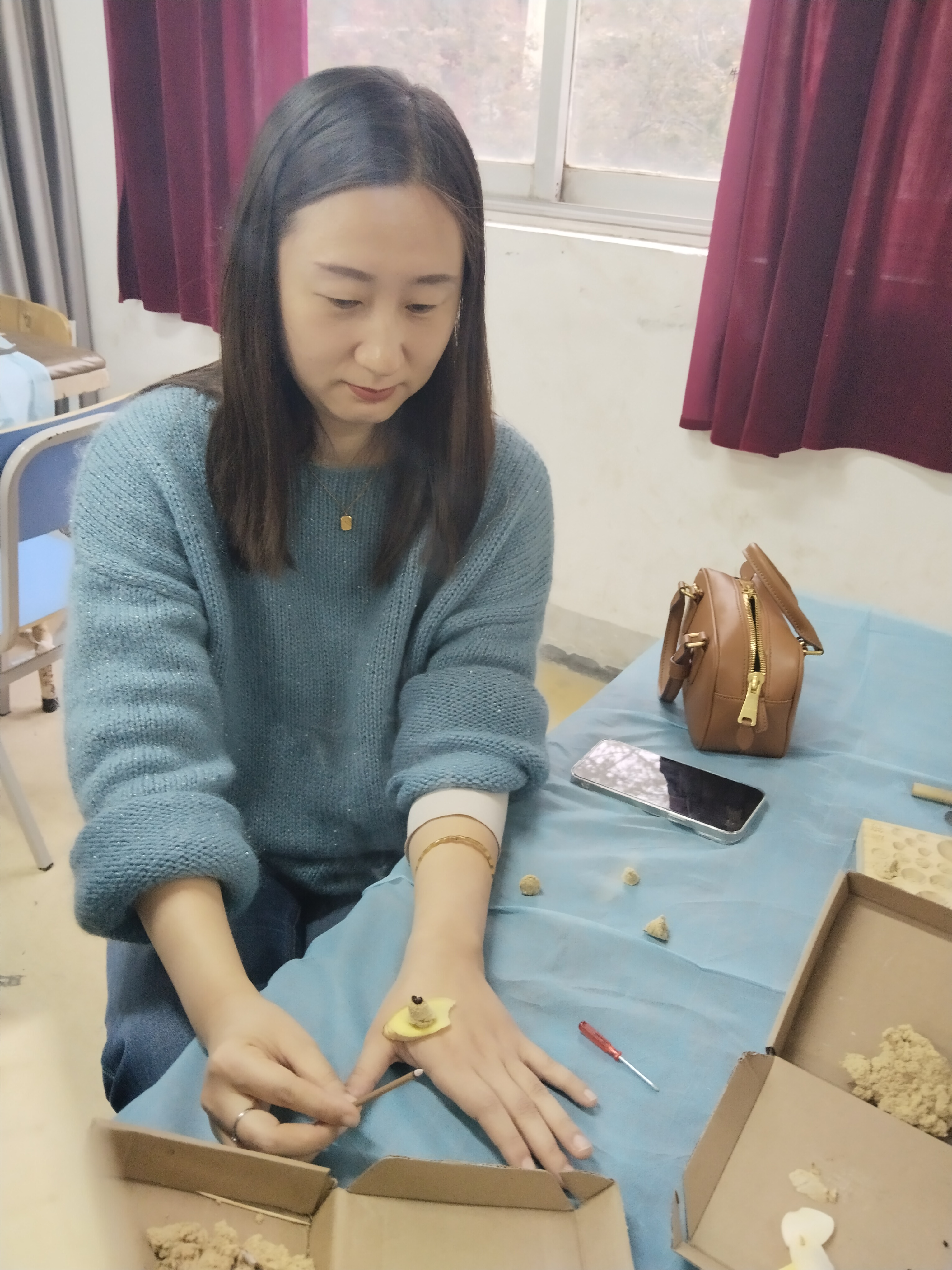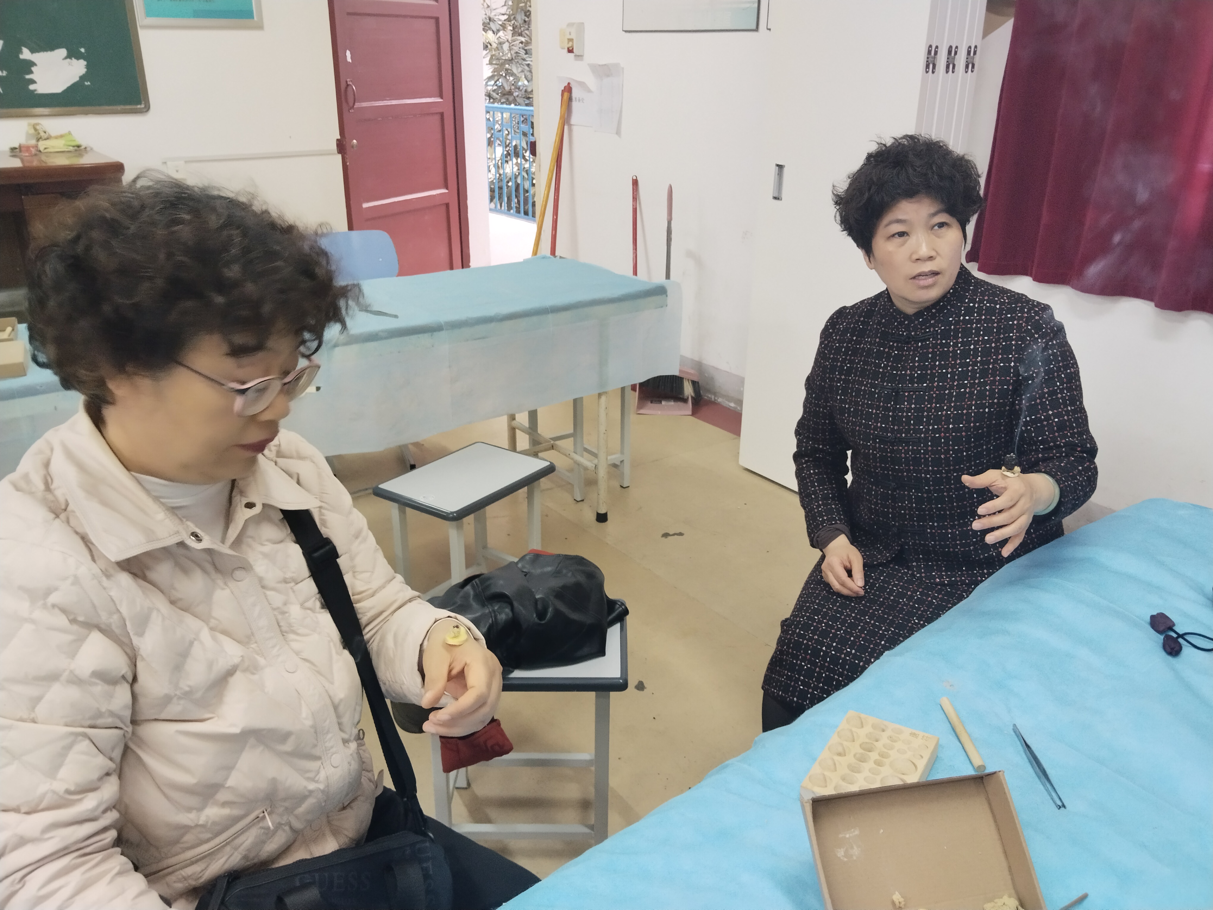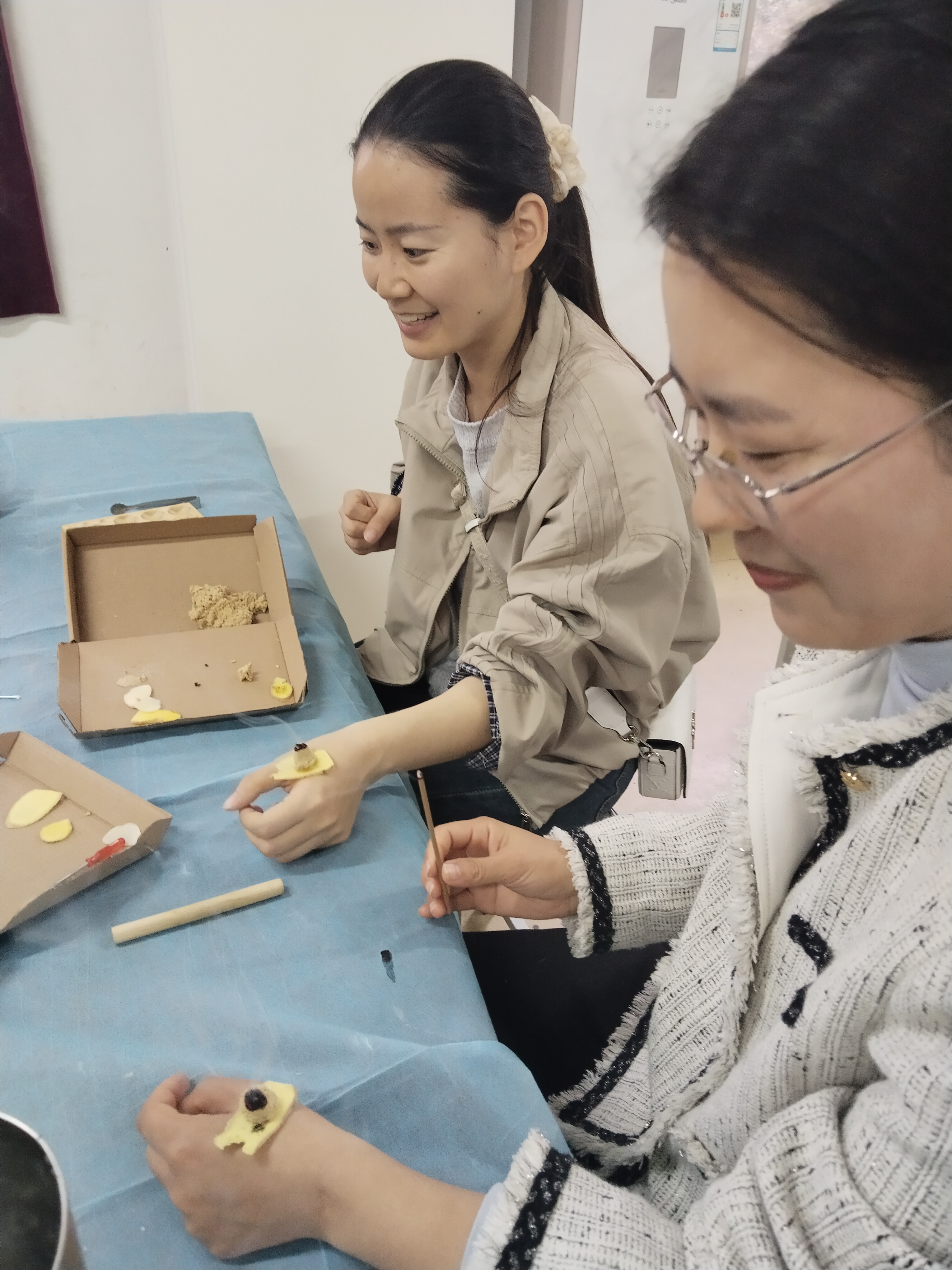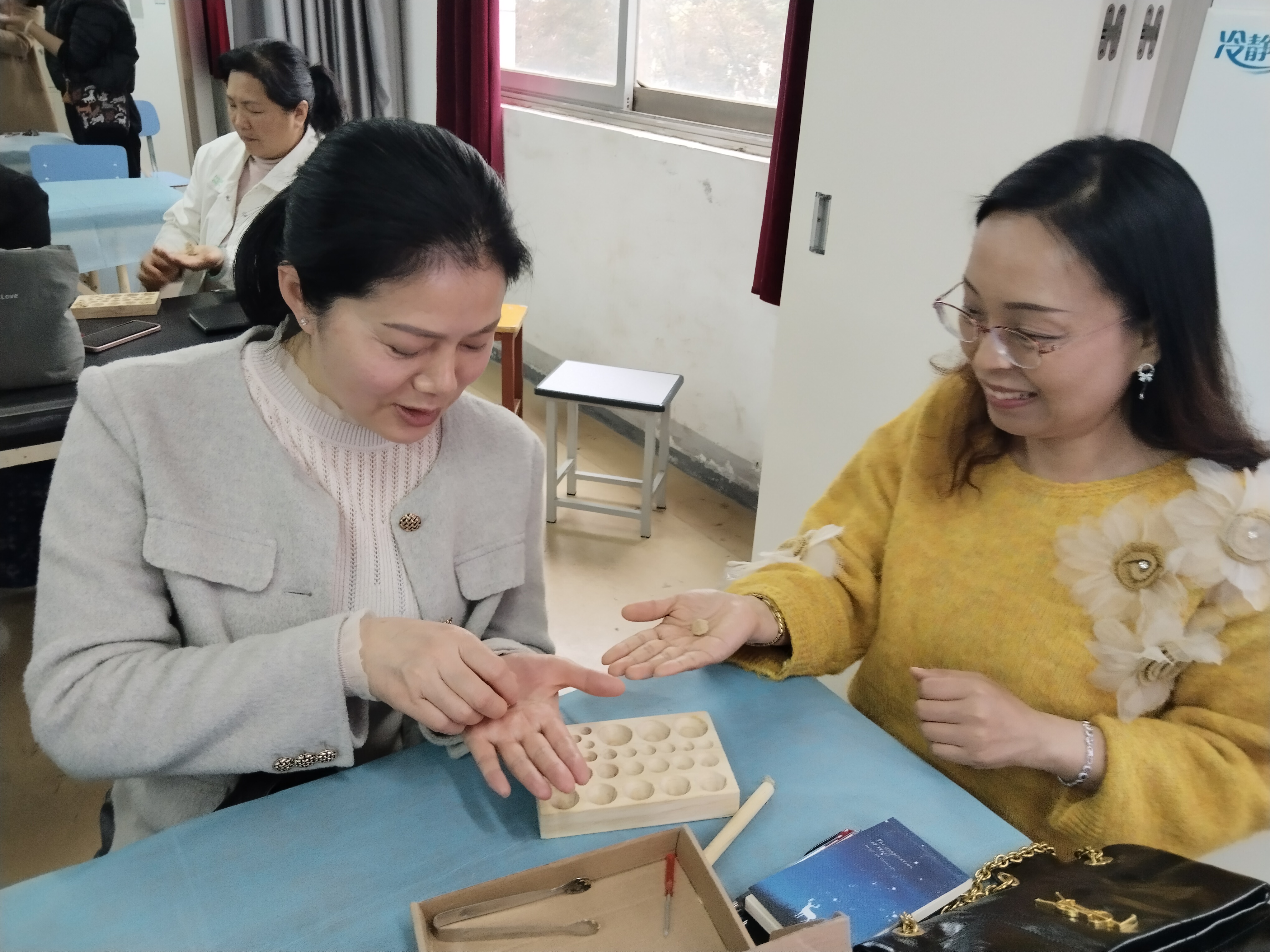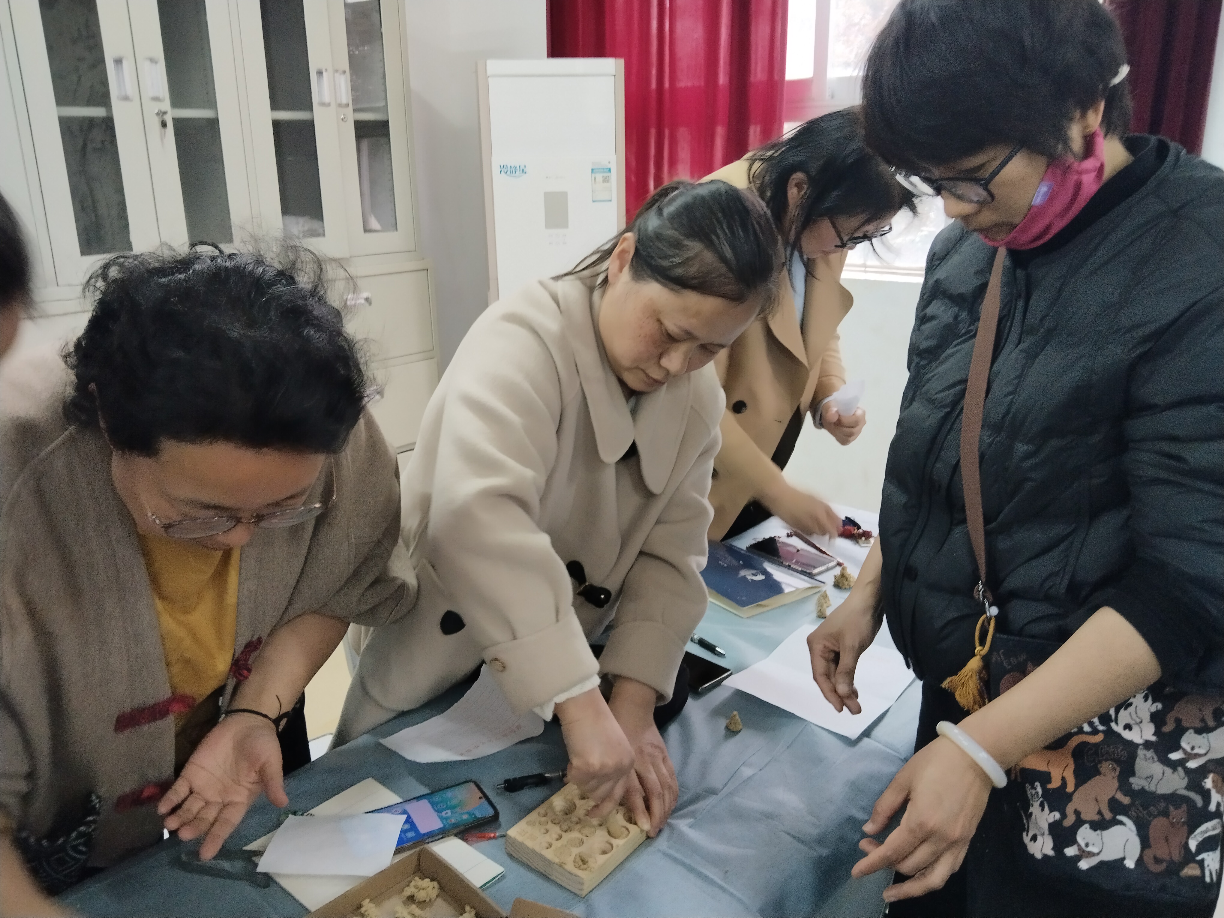 培训过程中,游老师注重理论与实践结合,现场指导老师们亲手制作艾柱,讲解艾柱捏制技巧、灸量单位“壮”的界定,并安排隔姜灸、隔蒜灸实操练习,让老师们在动手操作中掌握施灸要点,熟悉安全操作规范。老师们认真听讲、积极实操,及时请教疑问,现场学习氛围浓厚。