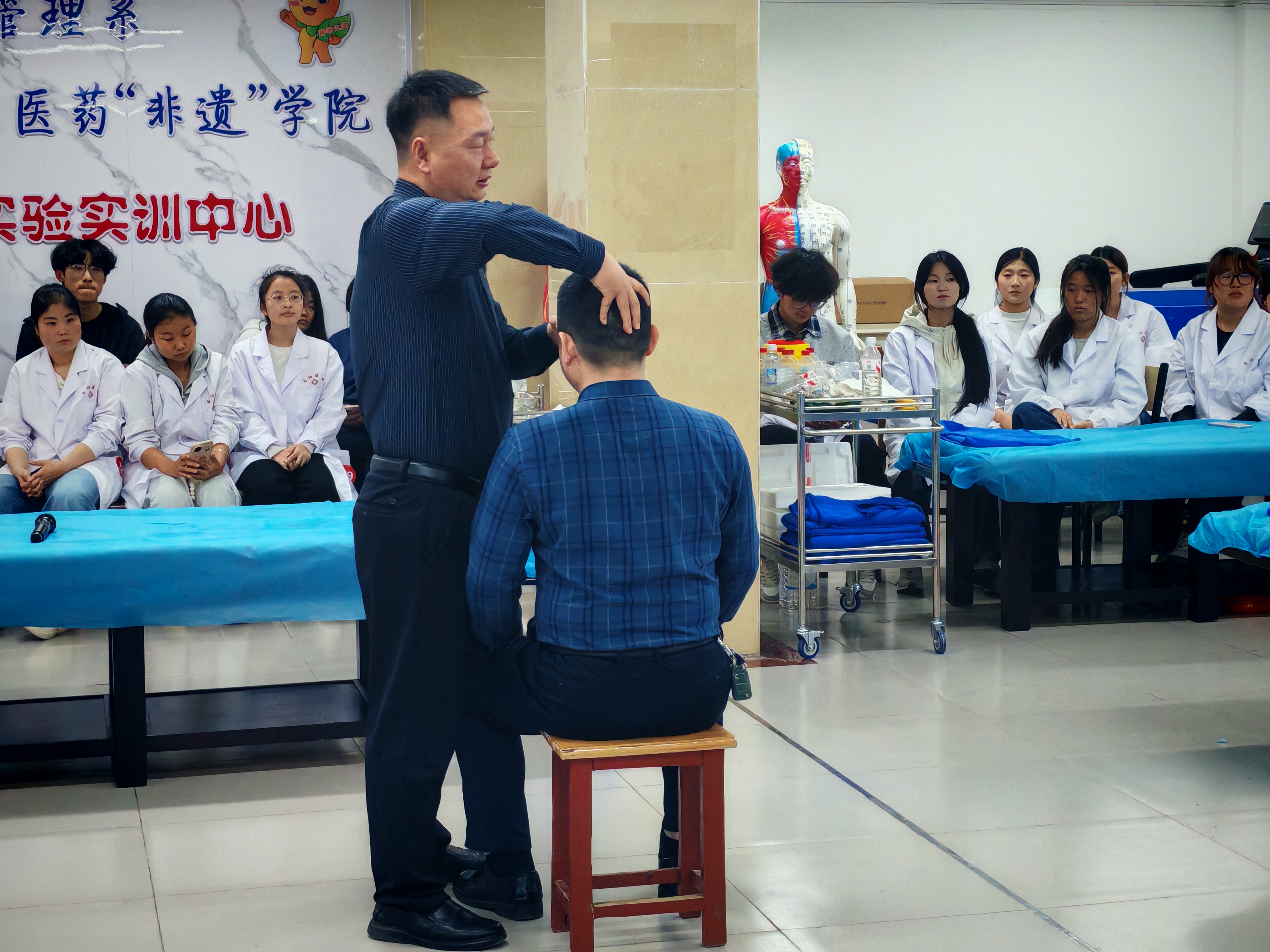健康管理系党总支书记刘怀东、主任张峰亲临现场指导。大赛特邀国家级非遗 “张氏经络收放疗法” 传承人王玉林、市级非遗 “火阳灸和银砭无痛刮痧术” 传承人张玉伟等行业专家,与校内专业教师共同组成评审组,确保比赛公平、公正、专业、权威。