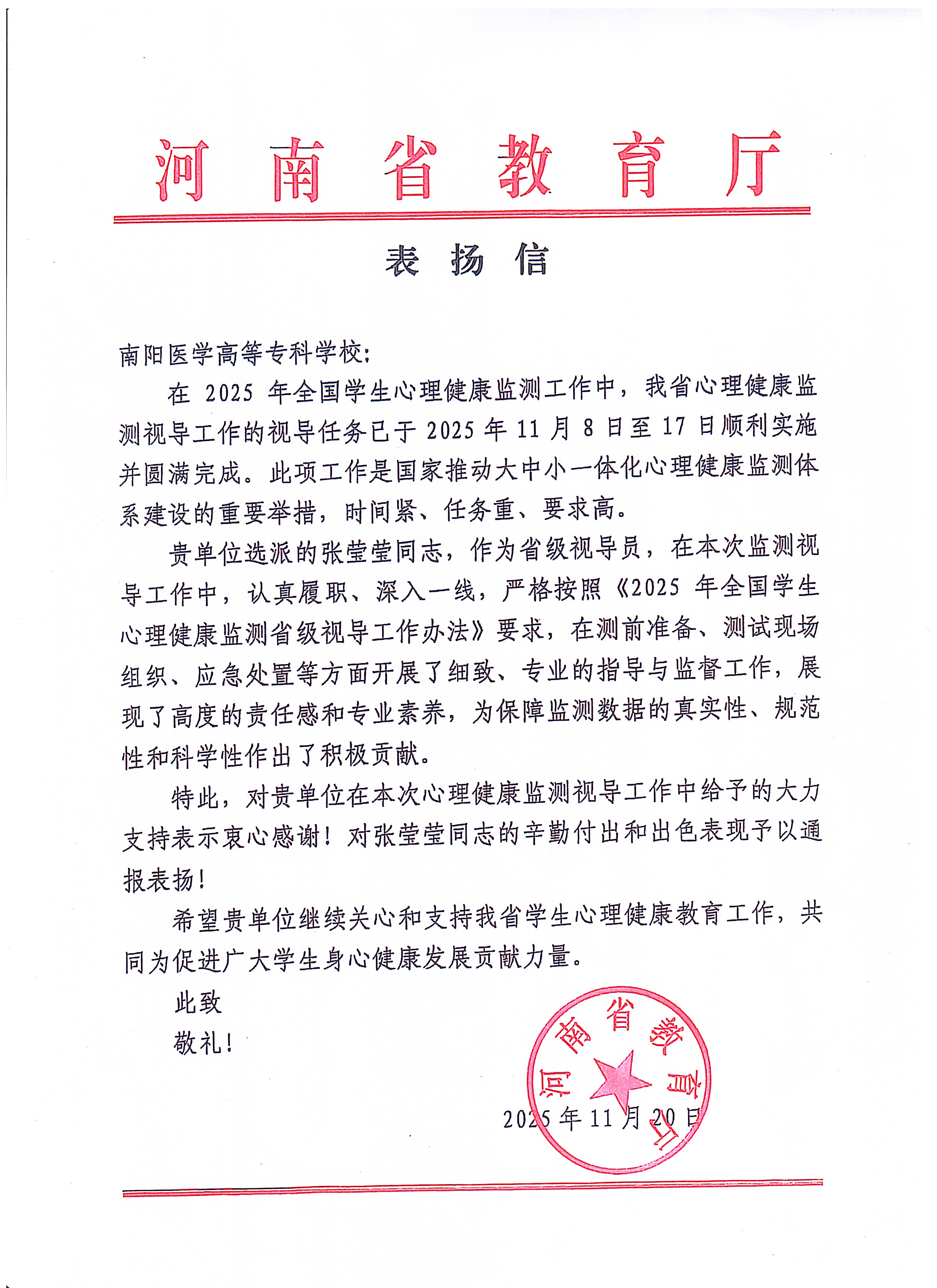 近日,河南省教育厅发布表扬信,对我系张莹莹同志在2025年全国学生心理健康监测视导工作中的突出表现予以通报表扬。